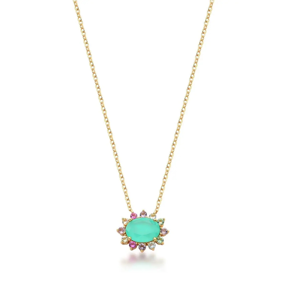 CORRENTE COM PINGENTE OVAL TURMALINA E COLORIDO BANHADA A OURO 40cm